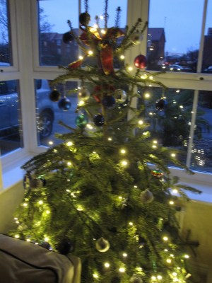 One last look at the Christmas tree celebrates an evergreen love of the three tenses captured by Dickens in the Christmas Carol. The light of God shone in the darkness (Genesis 1:3) long before there were sun, stars and moon. The light shone and shines in the darkness as our Lord is come. And before too long – just when the time is right – there will be no more darkness or night (Rev. 22:5).